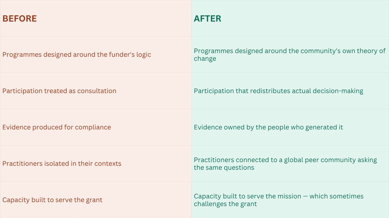 Foundations that work with us don't just give their grantees better professional development. They change the relationship. Partners come back with stronger proposals, more honest evidence, and a clearer sense of their own theory of change. Programme staff leave our sessions reading applications differently — less extractively, more as thought partners than gatekeepers. And the work that gets funded starts to look more like what communities are actually doing, rather than a performance of need designed to satisfy a review panel.