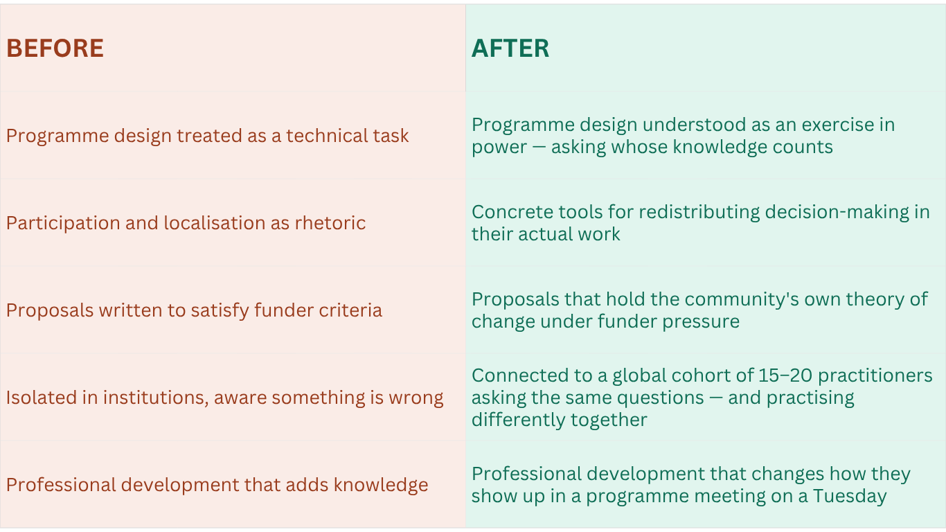 The Accelerator is particularly well-suited for grantee staff who hold design and proposal power — programme managers, MEL leads, fundraising teams — but who have had little space to interrogate the political assumptions baked into how that work is done.