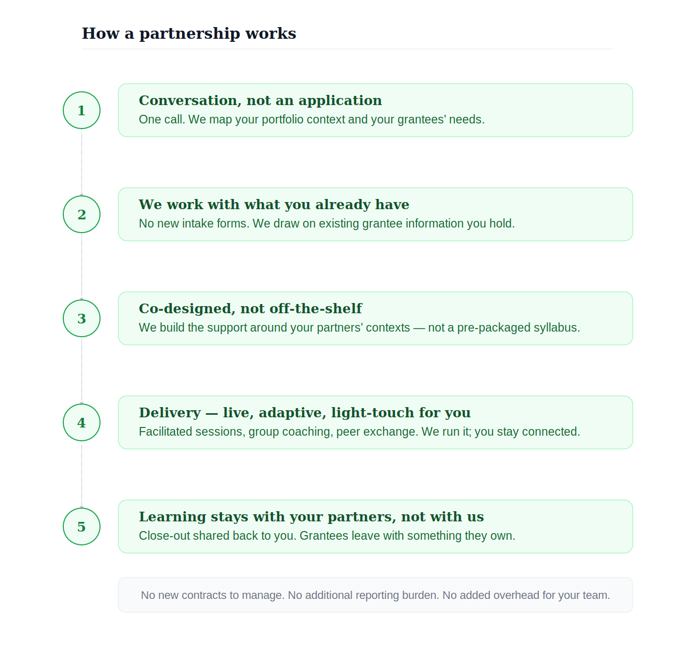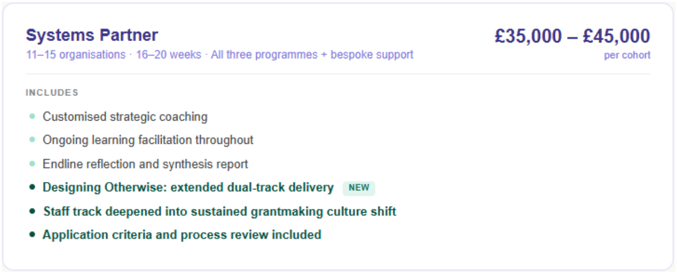 Most non-financial support offered to grantees is still designed around the funder's needs — their reporting cycles, their evidence frameworks, their definitions of what 'good' looks like. We offer something different.