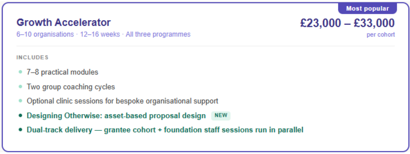 The Accelerator is our flagship open programme, with a new cohort starting June 5th 2026. Across eight weekly live sessions, it brings together practitioners, programme leads, and organisational leaders to interrogate and redesign how social impact work gets built — from proposals and budgets to participation and evidence.