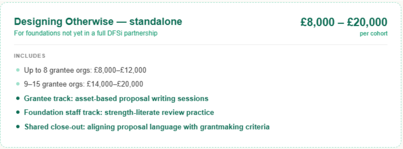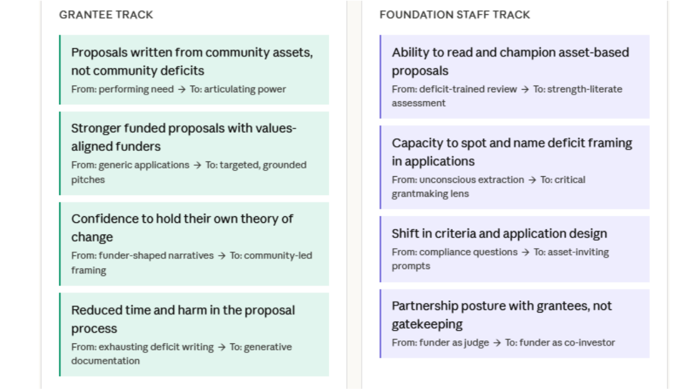 Designed for foundations investing in grassroots and community-led partners, Designing Otherwise is a dual-track training that works at both ends of the funding relationship — equipping grantees to propose from a place of strength, and equipping foundation staff to receive and reward what they find.