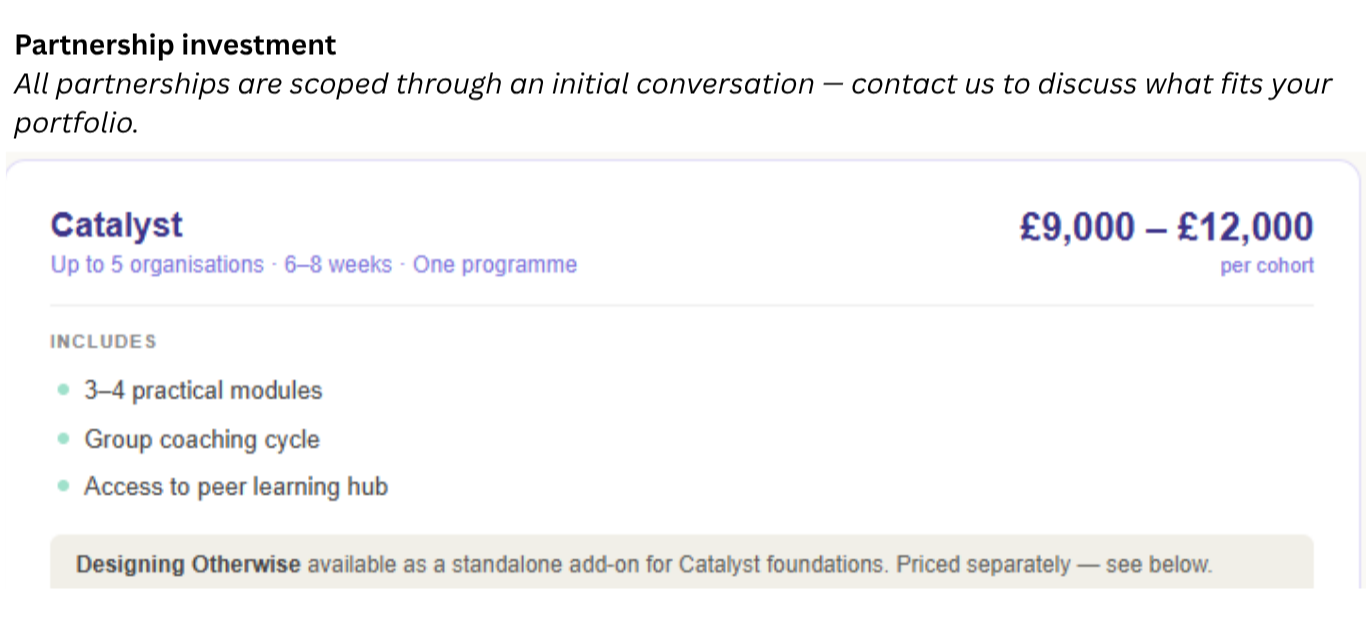 Whether you're looking for bespoke non-financial support for your grantee portfolio, cohort access to our open programmes, or a conversation about what your partners actually need — we'd love to hear from you.